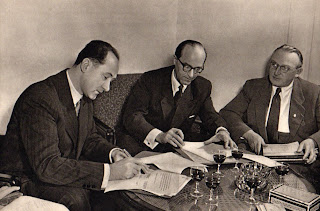 Der Präsident der Außenhandelskammer der Deutschen Demokratischen Republik, Dr. Lessing (Mitte), und der Stellvertretende Generalsekretär der Außenhandelskammer der Föderativen Volksrepublik Jugoslawien, Dr. Aliksic (links), unterzeichnen das zusätzliche deutsch-jugoslawische Handelsabkommen für das Jahr 1956.Preşedintele Camerei pentru Comerţul Exterior a Republicii Democrate Germane, Dr. Lessing (mijloc), şi secretarul general locţiitor al Camerei de Comerţ Exterior a Republicii Populare Federative Jugoslave, Dr. Aliksic (stînga), semneazä acordul comercial suplimentar germano-jugoslav pentru anul 1956.